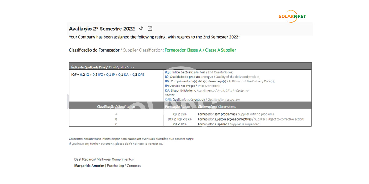 Temos orgulho de celebrar uma parceria de uma década com um dos nossos principais clientes europeus em Portugal. Ao longo dos nossos 10 anos de colaboração, mantivemos consistentemente o estatuto de fornecedor Classe A – a classificação mais alta dentro do seu sistema de classificação de três níveis (A, B e C).