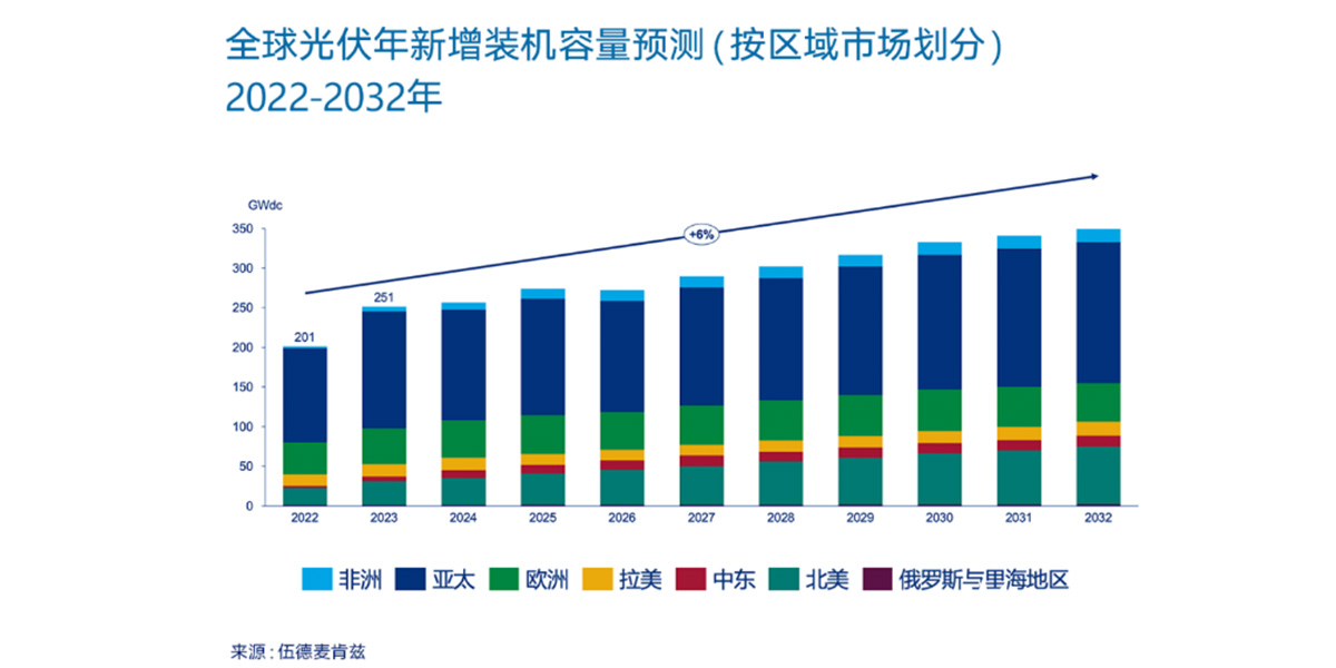 A Wood Mackenzie projeta um crescimento médio anual de 6% para instalações fotovoltaicas globais de 2022 a 2032, com a América do Norte ultrapassando a participação anual da Europa até 2028.