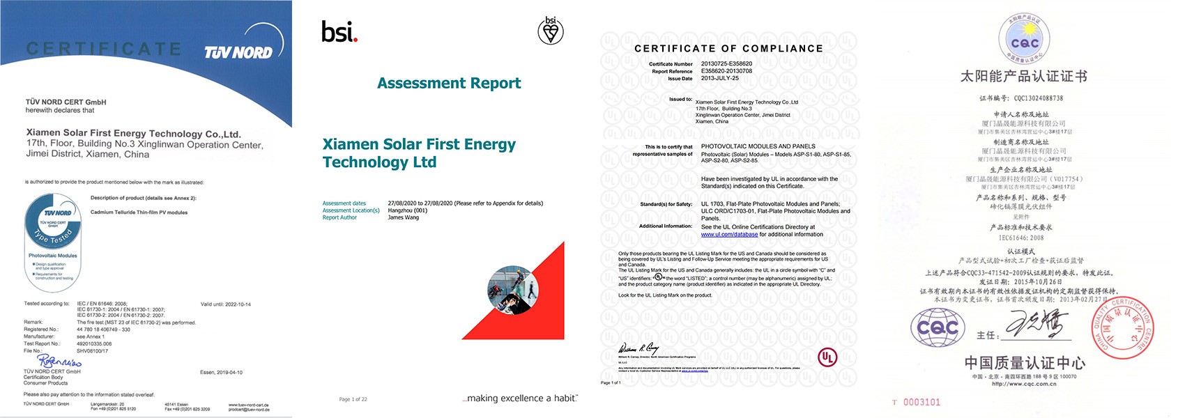 O vidro fotovoltaico de telureto de cádmio (CdTe) da Solar First foi certificado por instituições de renome mundial, como TUV SUD (TUV), British Standards Institution (BSI) e Micro Power Generation Product Certification Scheme (MCS).