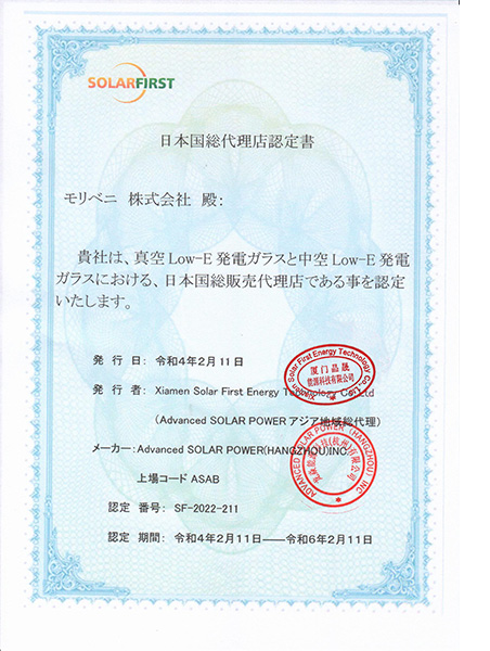 Em 11 de fevereiro de 2022, a Solar First assinou um acordo de agência exclusiva com a renomada empresa japonesa モリベニ 株式会社, autorizando-a como agente geral da empresa no Japão.