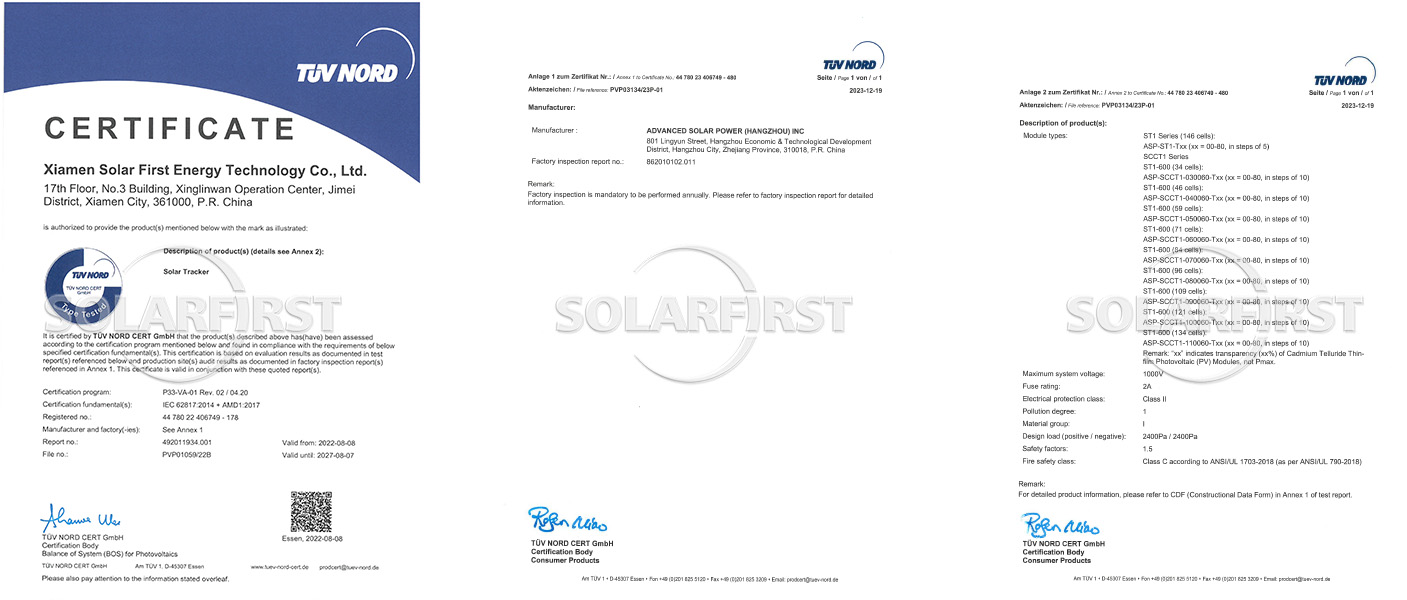 No início de agosto de 2022, os sistemas de rastreamento Horizon S-1V e Horizon D-2V, desenvolvidos de forma independente pelo Solar First Group, concluíram com sucesso os testes de certificação da TÜV Norte da Alemanha, garantindo a certificação IEC 62817. Este marco impulsiona os produtos de rastreamento da Solar First para os mercados internacionais, ao mesmo tempo em que valida sua estabilidade e confiabilidade por meio de reconhecimento global confiável.
