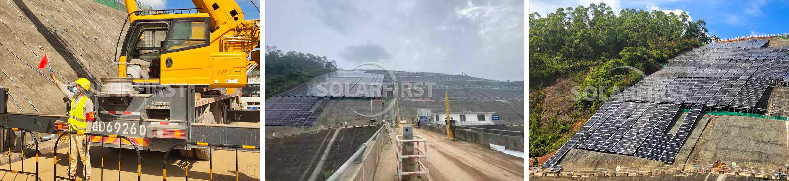 O projeto está localizado na encosta sul de uma usina hidrelétrica em Wuzhou, Guangxi. O terreno nesta área é complexo, com declives acentuados (35-45 graus) e irregulares, o que traz grandes dificuldades e desafios para o posicionamento, medição, construção e instalação, bem como para a operação segura. Após inúmeras investigações no local, discussões sobre o projeto, projetos e verificações, a equipe técnica do Solar First Group propôs uma solução científica, rigorosa e eficiente de suporte de cabos de suspensão flexíveis, baseada nas condições locais, garantindo o máximo aproveitamento de áreas montanhosas ociosas. Este projeto recebeu muitos elogios do proprietário em termos de projeto técnico, segurança de construção e eficiência.