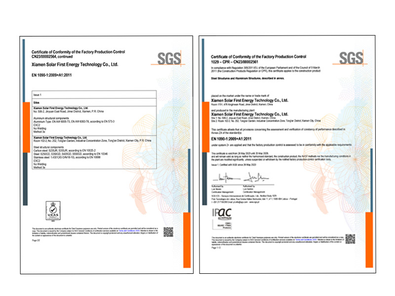 Esta certificação se aplica a Estruturas de Aço e Estruturas de Alumínio comercializado sob o Tecnologia de Energia Solar First Xiamen Co., Ltd. marca, fabricado nas instalações de produção da empresa.