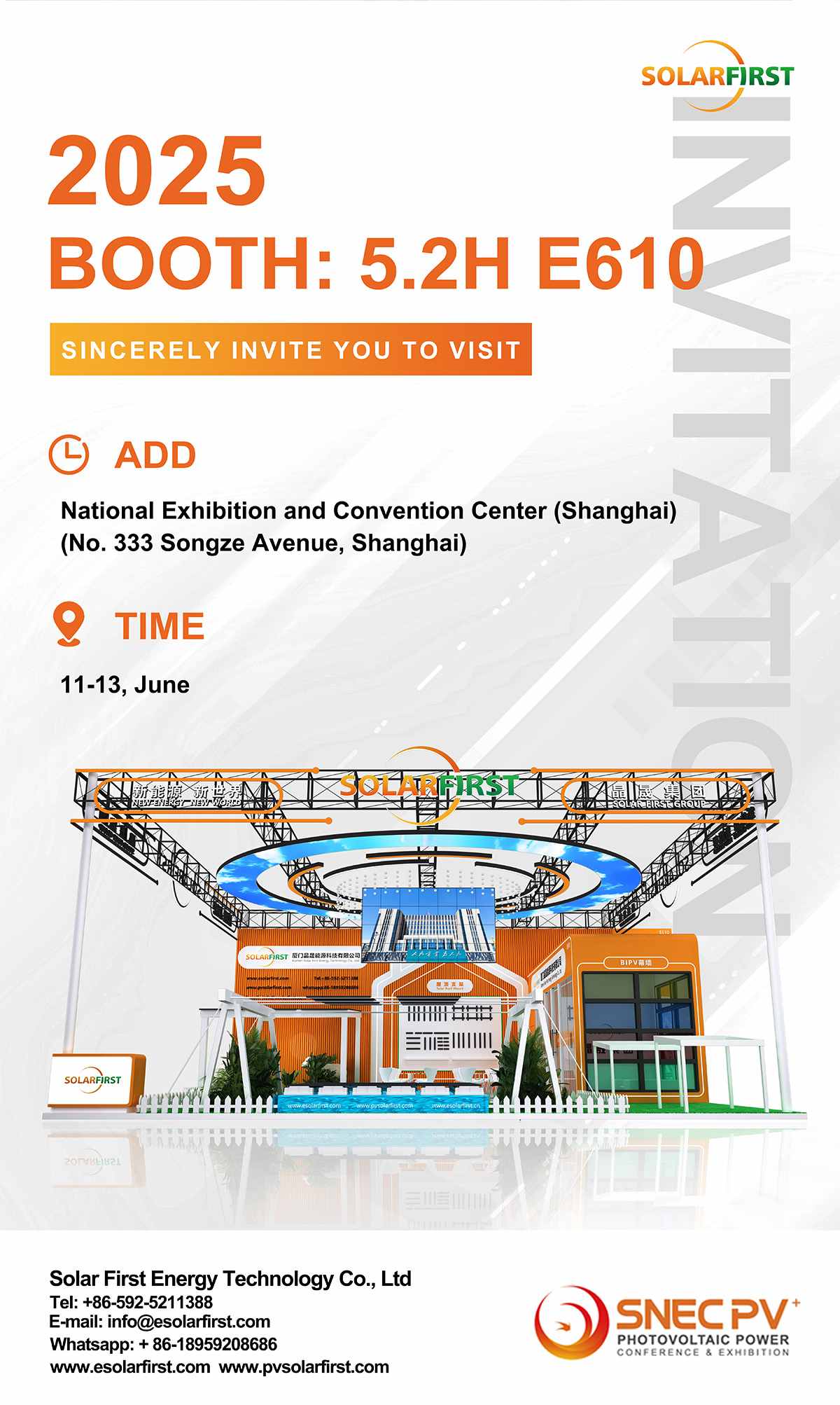 O Solar First Group dá as boas-vindas à 18ª Conferência Internacional SNEC sobre Energia Solar Fotovoltaica e Inteligente (Xangai), de 11 a 13 de junho de 2025, no Centro Nacional de Convenções de Xangai. Visite-nos no estande 5.2H-E610 para analisar soluções avançadas de energia limpa e discutir colaborações para o desenvolvimento sustentável.