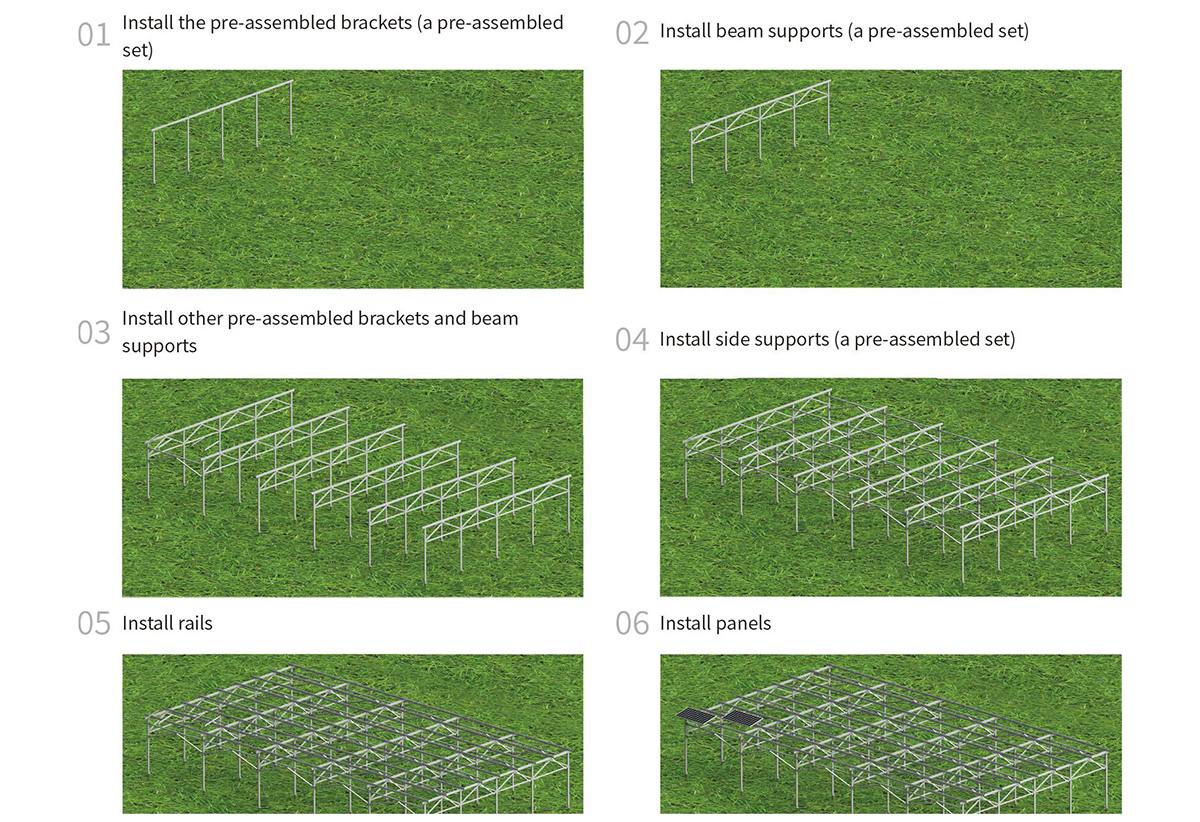 Este sistema de montagem solar agrícola foi projetado com flexibilidade em mente: pode ser construído em altura para permitir a passagem de máquinas agrícolas por baixo e espaçado para permitir que a luz solar atinja as plantações entre fileiras de painéis solares. Para aplicações que exigem cobertura total — como abrigos para gado, cultivo de fungos ou estufas — também é possível projetar uma estrutura totalmente à prova d'água e sombreada.