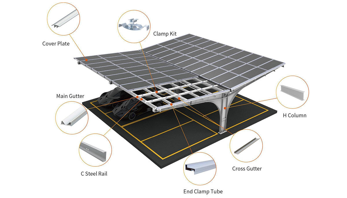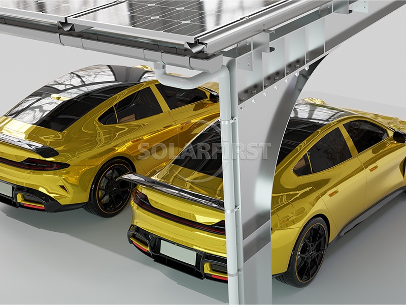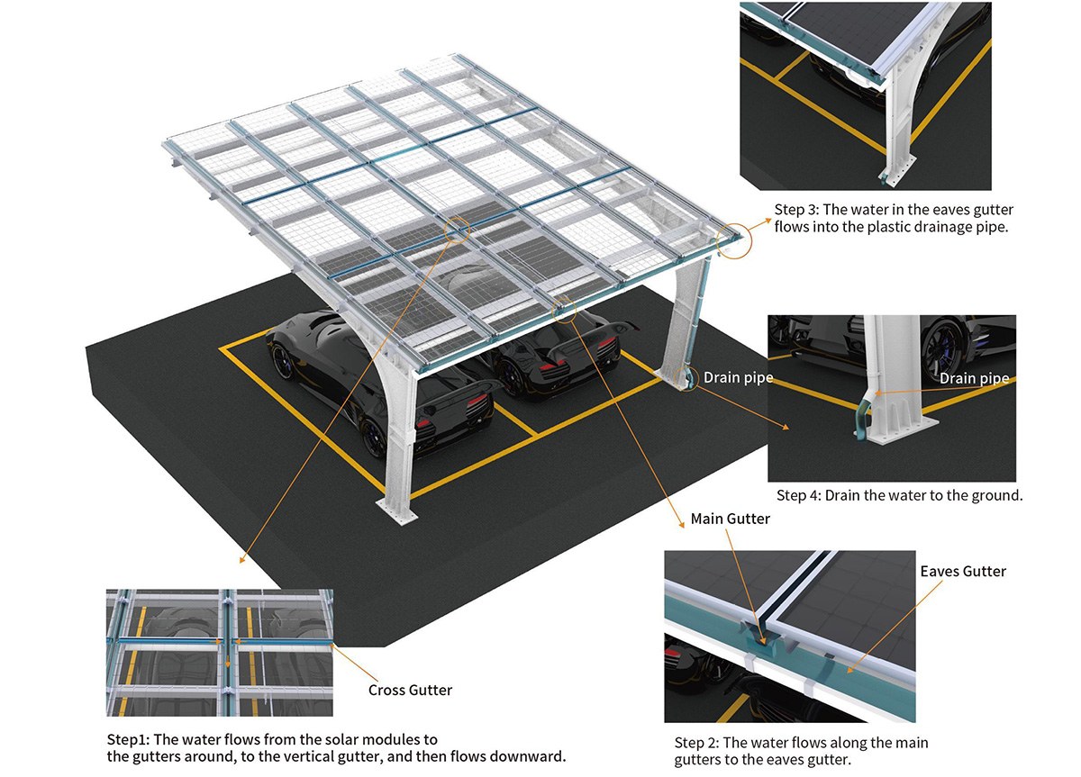 A cobertura de aço em balanço apresenta um design exclusivo à prova d'água que canaliza com eficiência a água da chuva dos vãos entre os módulos solares por meio de cortadores de drenagem, tubos e canais integrados, garantindo proteção confiável contra intempéries sem depender de adesivos ou enchimentos de borracha. Sua estrutura versátil em balanço adapta-se perfeitamente a estacionamentos retos e angulares, maximizando o aproveitamento do espaço e a cobertura de veículos.
