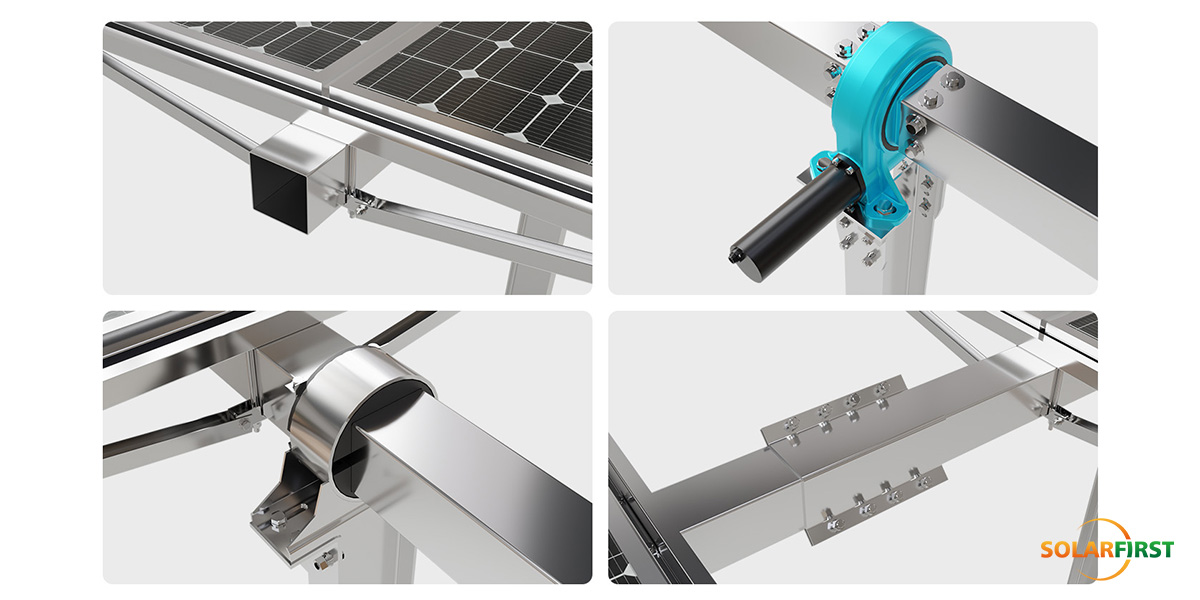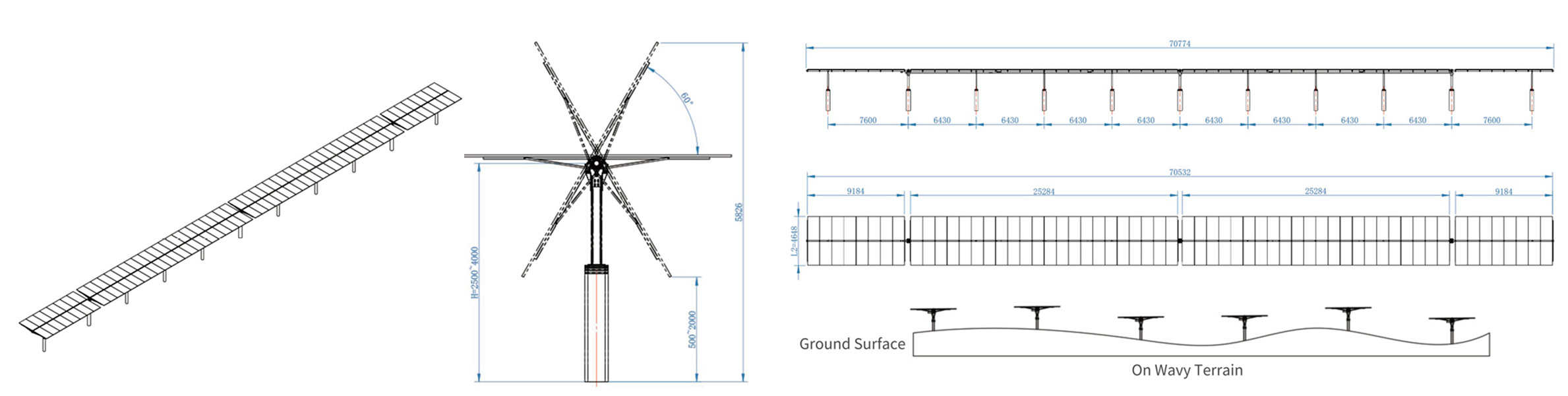 Com adaptabilidade de gradiente de até 15% na direção Norte-Sul, o rastreador apresenta desempenho confiável em terrenos irregulares. Seu sistema de acionamento multiponto melhora substancialmente a resistência à torção do vento e aumenta a tolerância à velocidade crítica do vento, proporcionando operação estável em ventos de até 45 m/s. Compatível com módulos solares de células de 182 mm e 210 mm, cada rastreador pode acomodar até 120 módulos e é configurável para tensões de sistema de 1000 V ou 1500 V.