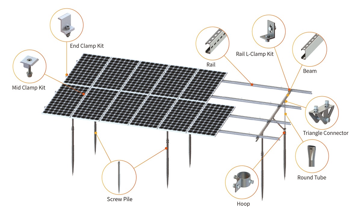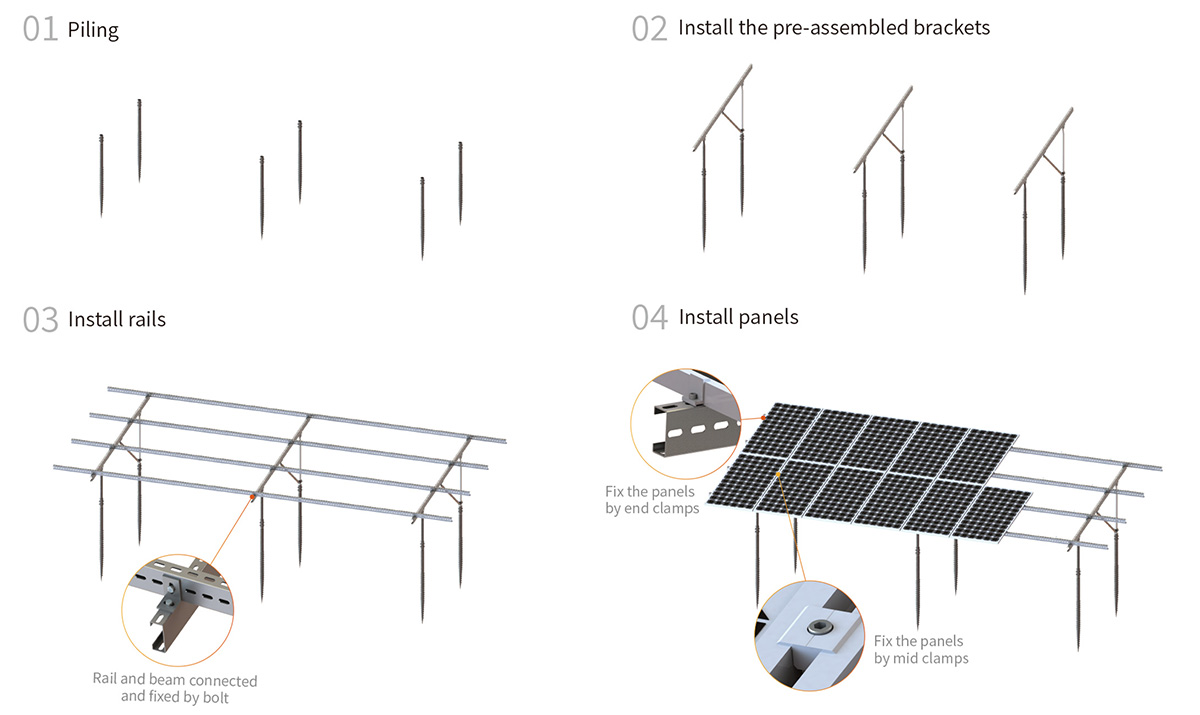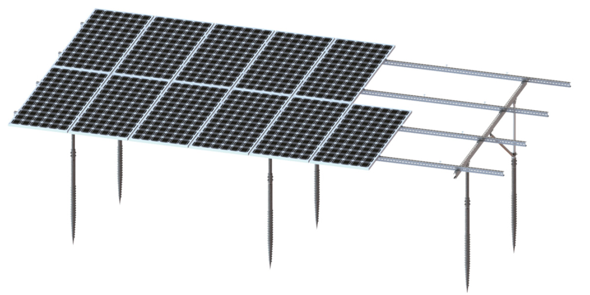 Projetado com versatilidade e custo-benefício em mente, o sistema utiliza perfis de aço otimizados, como perfis C e U, para reduzir custos de material e mão de obra, simplificando a instalação. Seja para uso em parques solares de grande porte ou em projetos comerciais, esta solução oferece uma opção eficiente e durável para painéis solares montados no solo.