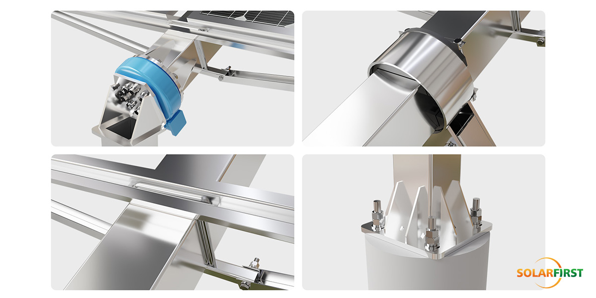 O Rastreador Solar de Eixo Único Inclinado da Série Tilt foi projetado para usinas solares de grande porte, especialmente em regiões de latitudes mais altas, oferecendo um equilíbrio ideal entre produção de energia e robustez estrutural. Este sistema apresenta um design de eixo único inclinado que gira entre os planos horizontal e vertical, maximizando a exposição solar, mantendo um perfil de vento baixo e distância ao solo para maior segurança e eficiência de espaço.